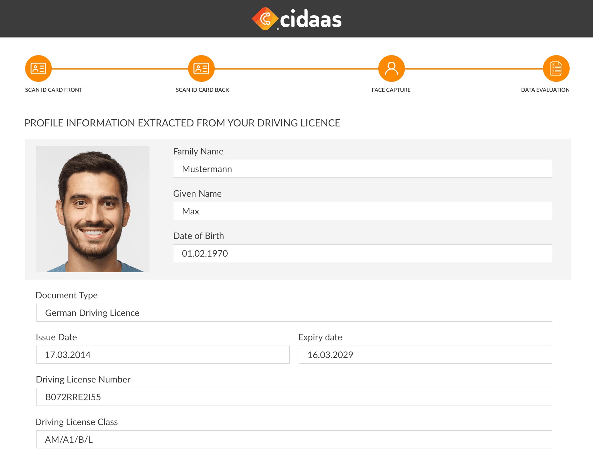 The cidaas ID detects the type of badge and checks for its authenticity using badge-specific security features. Personal and biometric data are extracted, and the validity is analysed.
