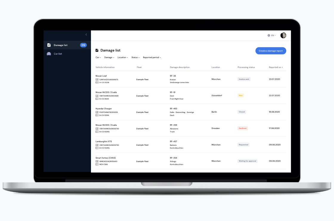 Our accident & damage reporting allows you to have a live overview of the fleet condition at any time and significantly increase the utilization of your fleet. With our web-based app and dashboard, we enable you to react to vehicle damages and service issues at an early stage and reduce your damage-related costs.