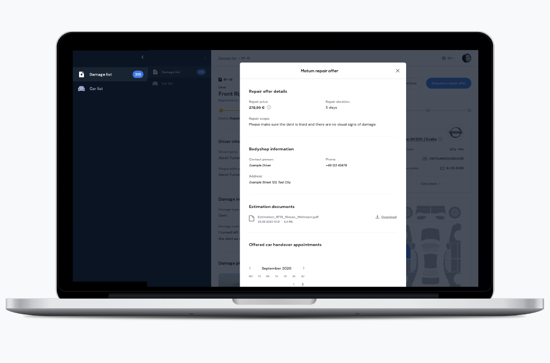 With our web-app solution, you can enable your drivers to get a live overview of the car condition and report new damages & service requests easily.